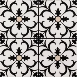 Die Bodenfliesen Ornamenti Trieste in Blumenoptik verleihen Ihrem Innenbereich eine harmonische Mischung aus Schwarz, Beige und Weiß. Die matte Oberfläche und eine Stärke von 8mm verleihen ihnen eine robuste Struktur.
