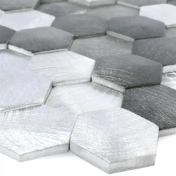 Die Metall 3D Mosaikfliesen Sindos Hexagon Schwarz Silber in der Form eines Sechseck, sind optisch ein neuer Trend und hier bekommt der Nutzer unterschiedliche Höhe bei seinen Wandfliesen. Die weitere Besonderheit, diese Fliesen sind aus Aluminium und besitzen maginale Wirkung. Das sind einmal optisch sehr wirkungsvolle und innovative Ideen, die hier bei diesen Wandfliesen umgesetzt werden. Diese Mosaike sind in einer Matte zusammen gefasst und dass erleichtert die Verlegung.
