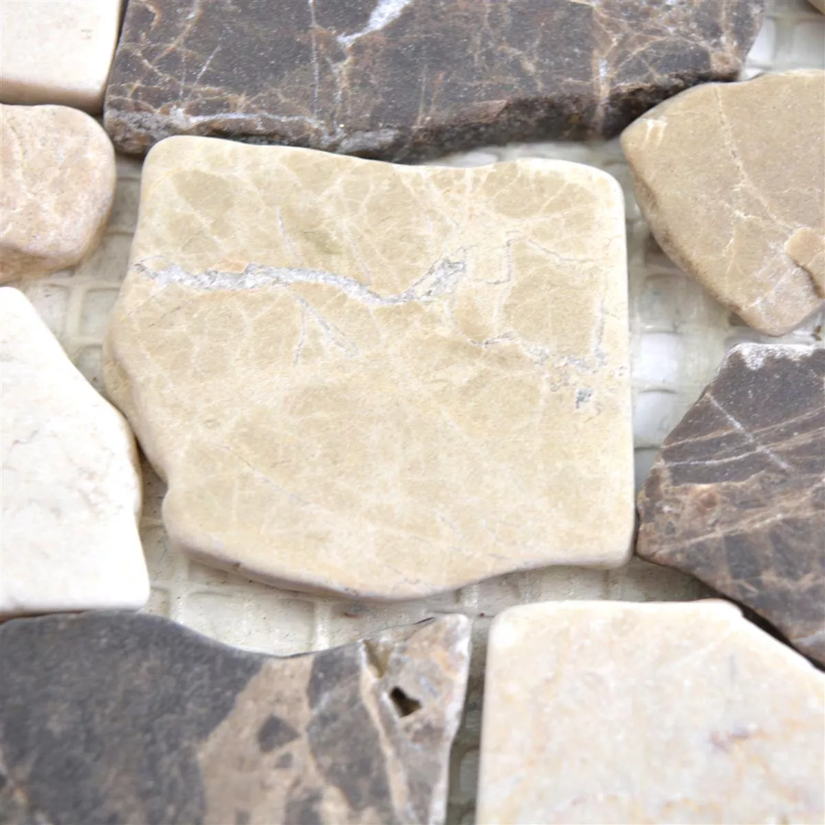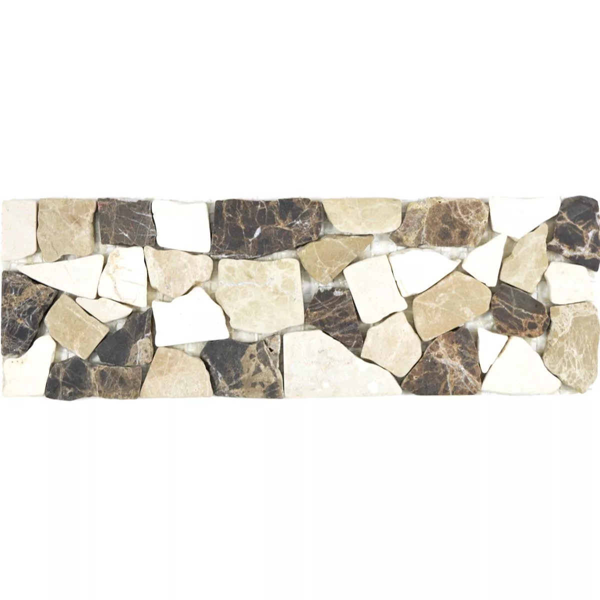 Die Fliesenbordüre ist aus 7 Millimeter starke, 20 bis 40 Millimeter großen Natursteinen mit matter Oberfläche gefertigt. Naturstein ist langlebig, strapazierfähig, frostbeständig und frostsicher und kann deshalb zur Gestaltung in Innen- und Outdoorbereichen eingesetzt werden. Sie ist zu nahezu allen Wand- und Bodenfliesen kombinierbar. Eine einfache Verlegung durch Hobbyheimwerker ist durch die Befestigung auf 10×30 Zentimeter großen Matten sichergestellt. Die pflegeleichte Oberfläche ist leicht und schnell zu reinigen.
